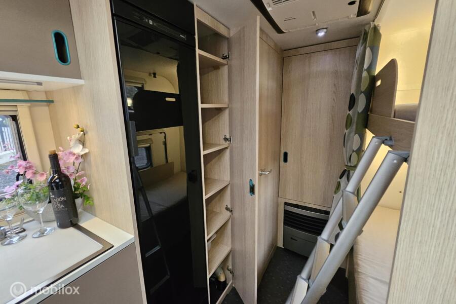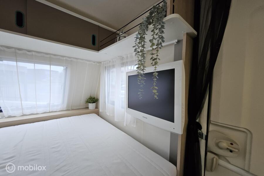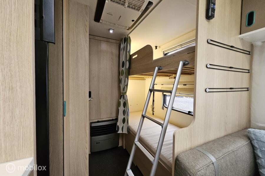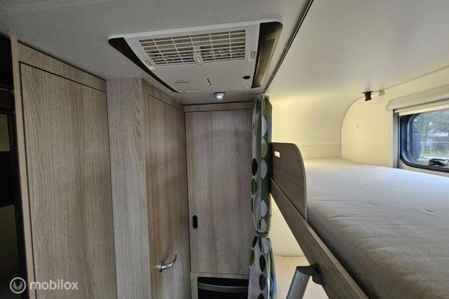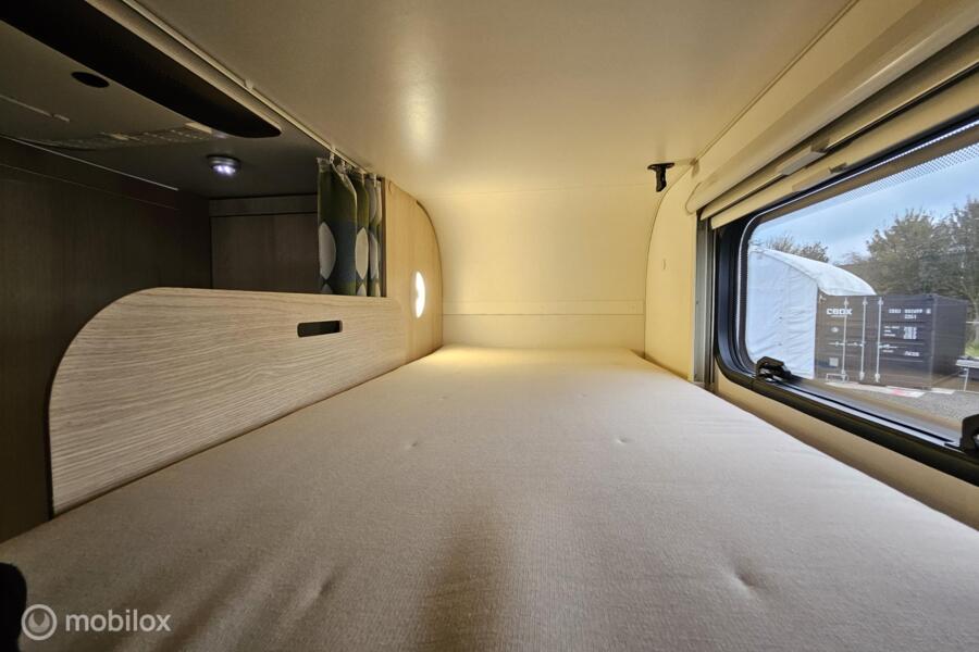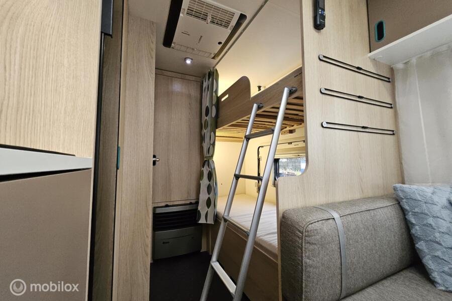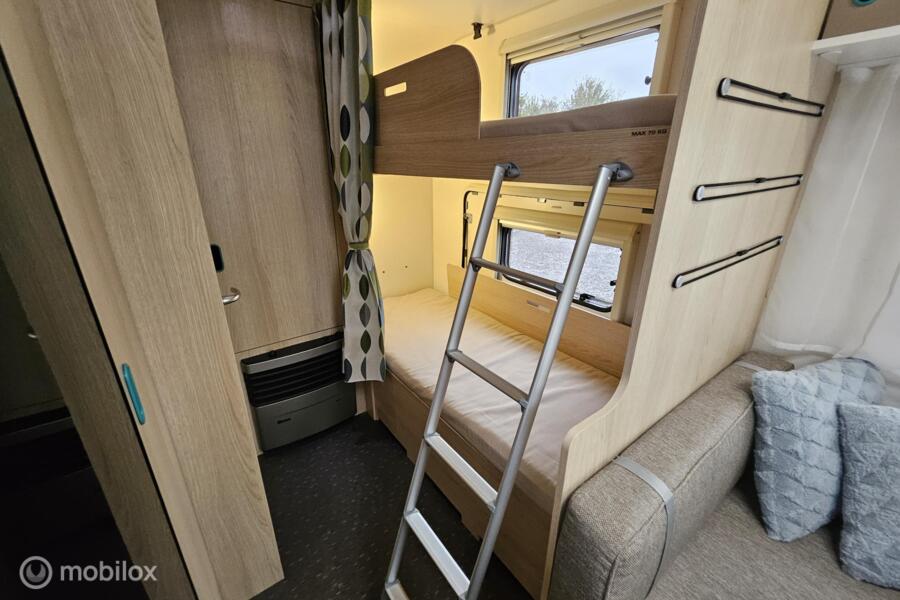Indeling & uitrusting: • Stapelbed achterin (75x180 cm) • Vast bed voorin (140x213 cm) • Middenzit om te bouwen tot bed (100x180 cm) • Badkamer met douche, toilet en wasbak • Boiler • Truma kachel met ringverwarming • Truma Airco • Grote Thetford koelkast met vriesvak • 3-pits Dometic gasfornuis • TV • Led-verlichting • Thule fietsendrager op de dissel (voor 3 fietsen)