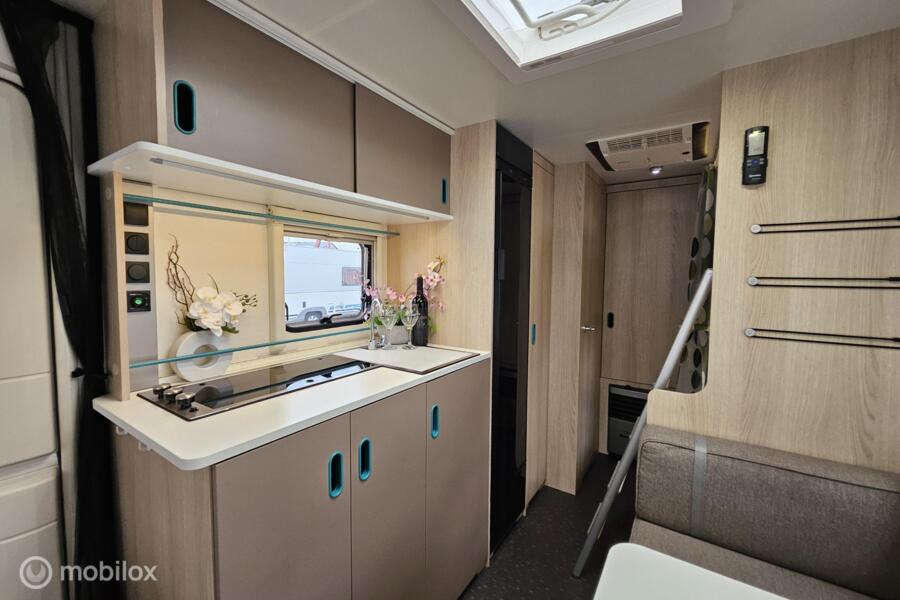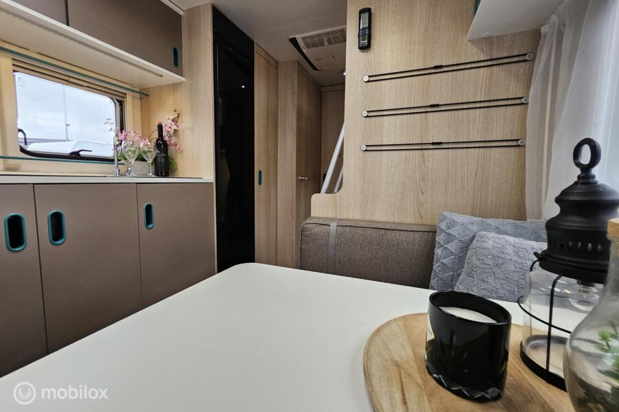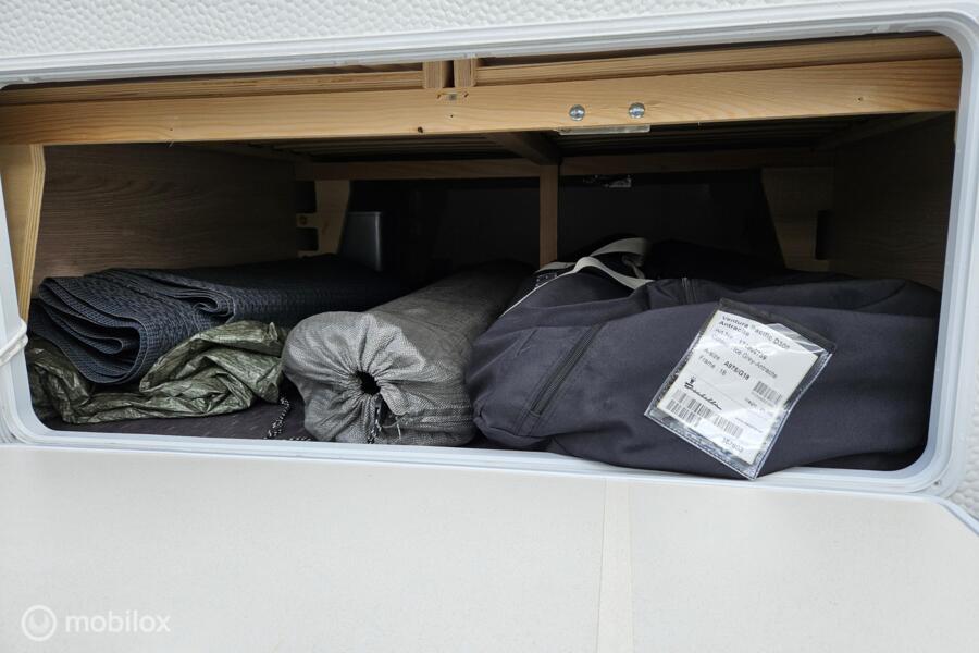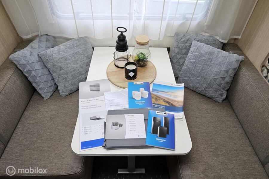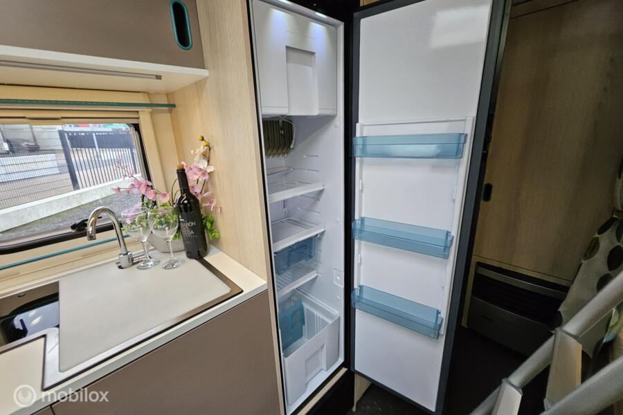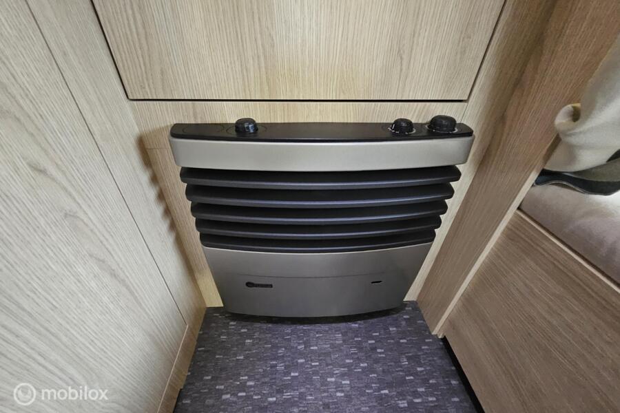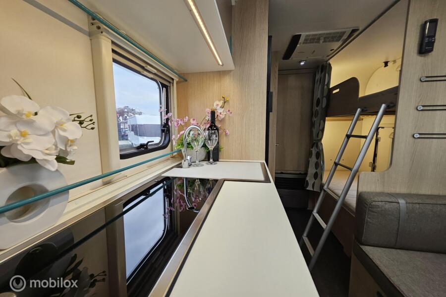 Indeling & uitrusting: • Stapelbed achterin (75x180 cm) • Vast bed voorin (140x213 cm) • Middenzit om te bouwen tot bed (100x180 cm) • Badkamer met douche, toilet en wasbak • Boiler • Truma kachel met ringverwarming • Truma Airco • Grote Thetford koelkast met vriesvak • 3-pits Dometic gasfornuis • TV • Led-verlichting • Thule fietsendrager op de dissel (voor 3 fietsen)