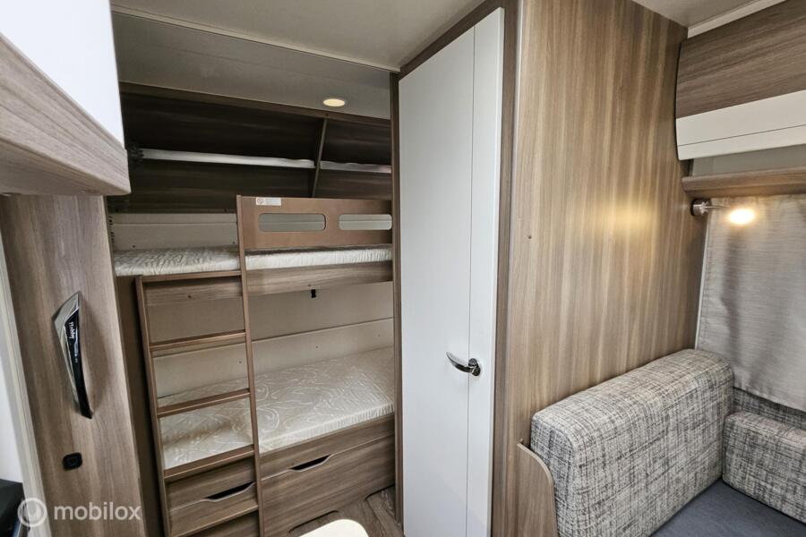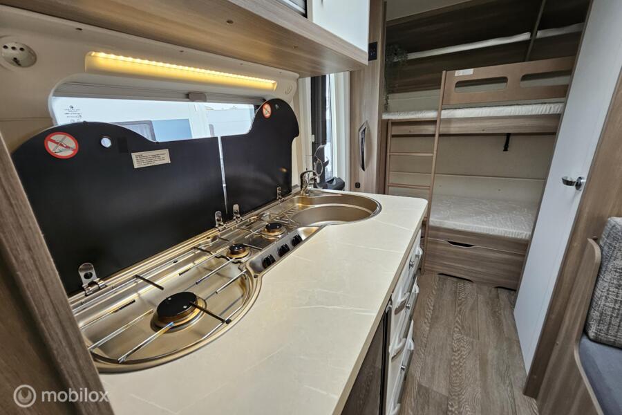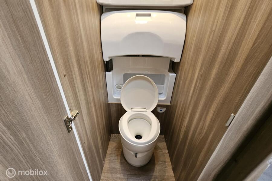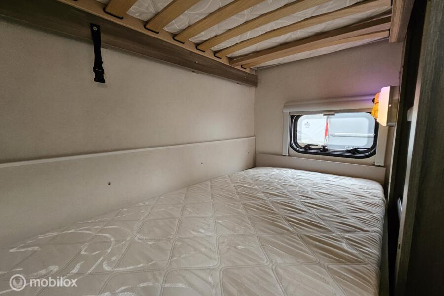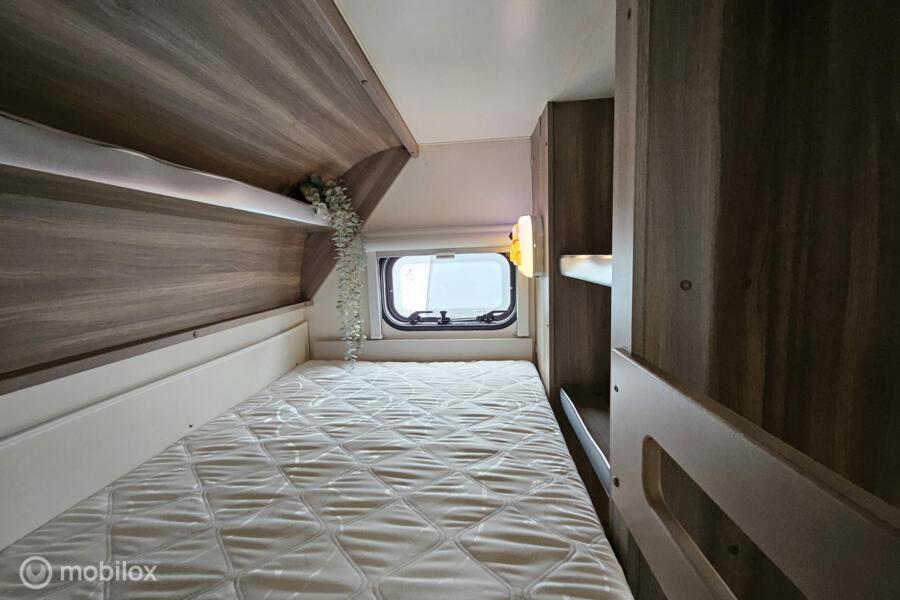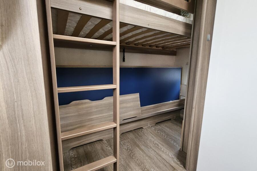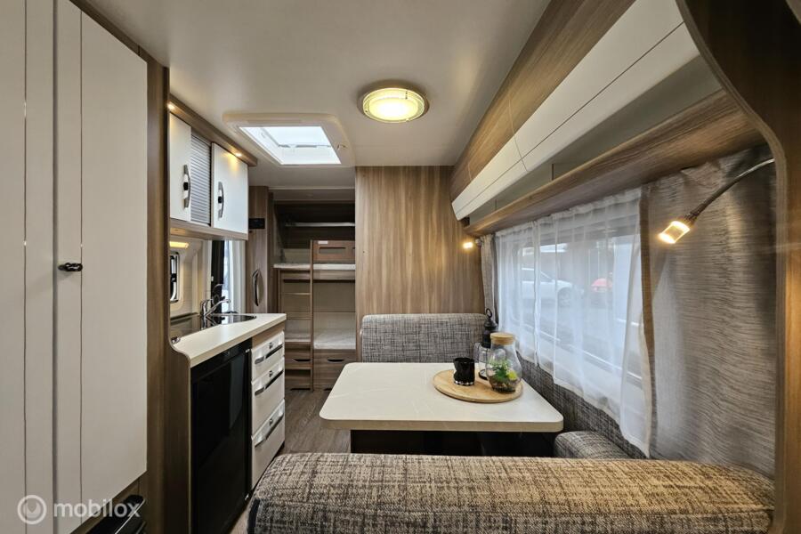 Indeling: - Dwarsbed (130 x 200 cm) - Stapelbed (75 x 200 cm & 70 x 200 cm) - Omgebouwde dinette (88 x 185 cm) - Middenkeuken en midden-zitgroep - Ruime toiletruimte met cassettetoilet